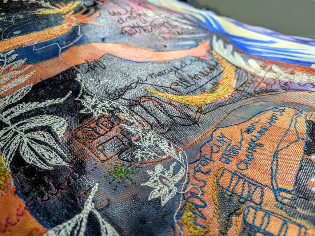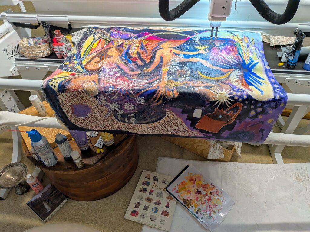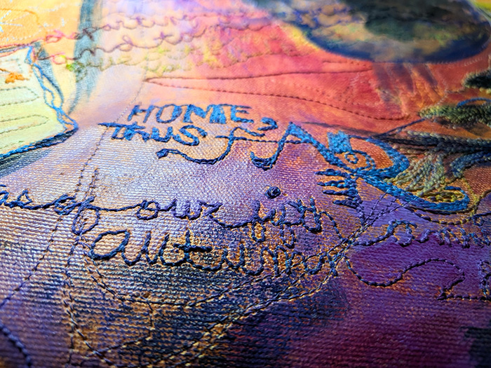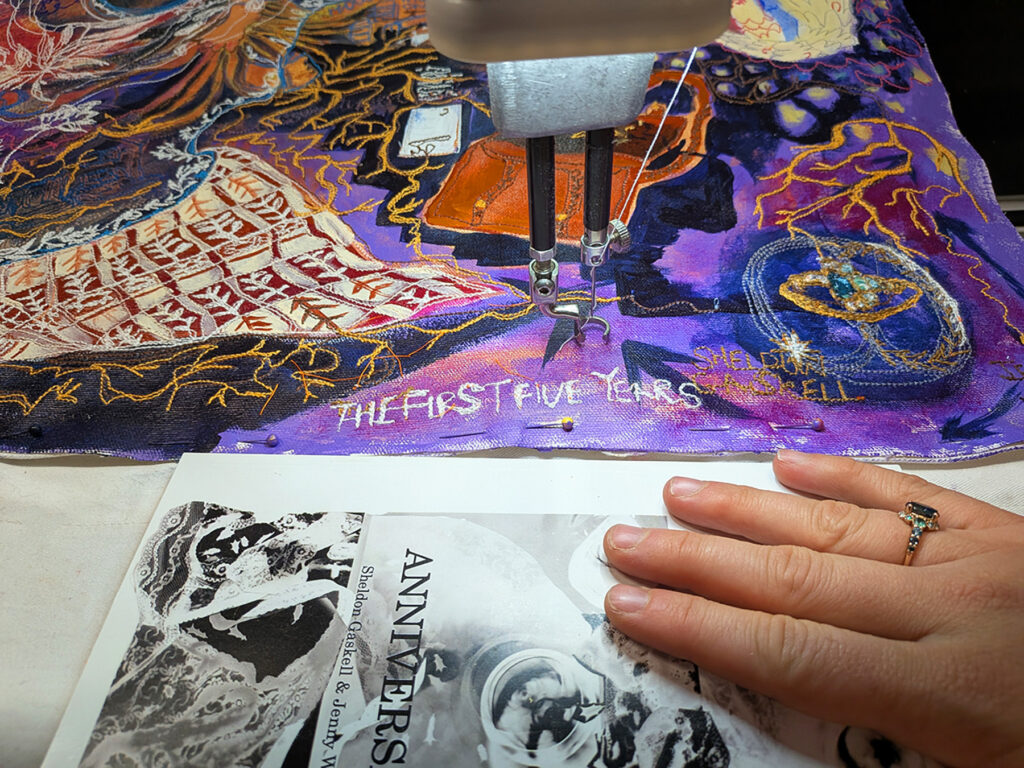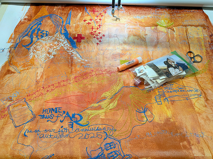 The First Five Years (Home, Thus Far) is free-motion stitchwork and mixed media on cotton canvas. Each object represented in this artwork is significant in our marital journey, with an emphasis on the special anniversary gifts we’ve given to one another through the years. In times of continually asking where our home might be, these objects compile a semblance of our identity. It feels like a portrait of us at this current time: Lots of abundance and detail and beauty, golden gifts from past: future promise and possibilities, and also a feeling of searching, or being lost or swept up, and looking in seperate directions and reaching for one another.