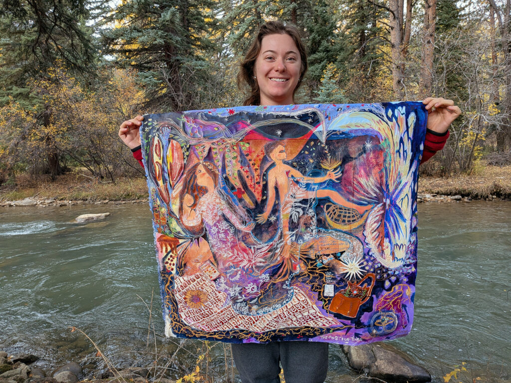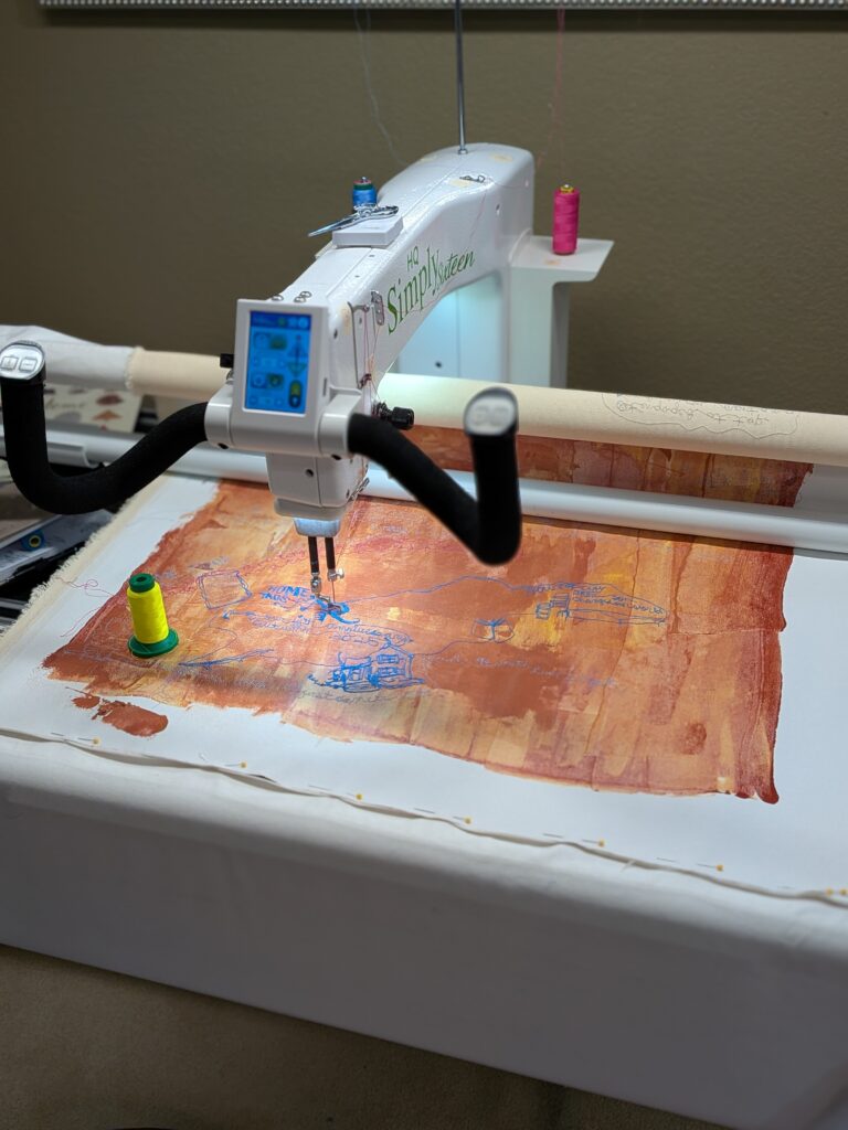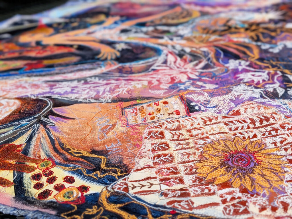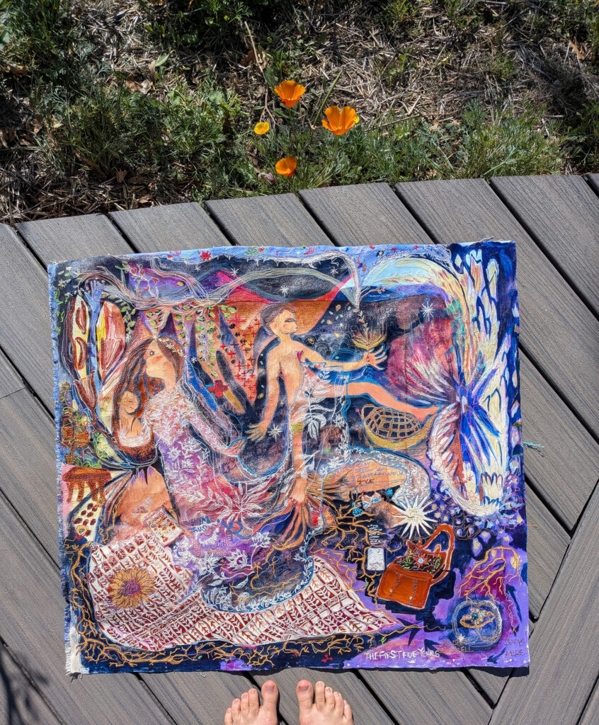 The First Five Years (Home, Thus Far) is free-motion stitchwork and mixed media on cotton canvas. Each object represented in this artwork is significant in our marital journey, with an emphasis on the special anniversary gifts we’ve given to one another through the years. In times of continually asking where our home might be, these objects compile a semblance of our identity. It feels like a portrait of us at this current time: Lots of abundance and detail and beauty, golden gifts from past: future promise and possibilities, and also a feeling of searching, or being lost or swept up, and looking in seperate directions and reaching for one another.